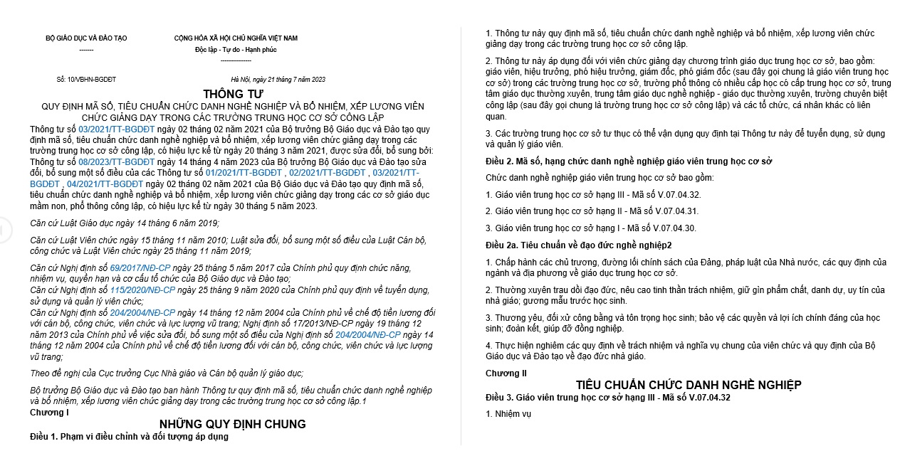 Bộ trưởng Bộ Giáo dục và Đào tạo ban hành Thông tư quy định mã số, tiêu chuẩn chức danh nghề nghiệp và bổ nhiệm, xếp lương viên chức giảng dạy trong các trường trung học cơ sở công lập.1