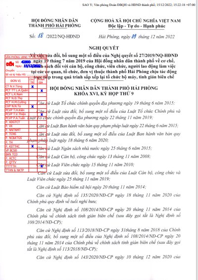 "Về việc sửa đổi, bổ sung một số điều của Nghị Quyết số 27/2019/NQ-HĐND ngày 19/7/2019 của Hội đồng nhân dân thành phố về cơ chế, chính sách đối với cán bộ, công chức, viên chức, người lao động làm việc tại các cơ quan, tổ chức, đơn vị thuộc thành phố Hải Phòng chịu tác động trực tiếp trong quá trình sắp xếp lại tổ chức bộ máy, tinh giản biên chế"